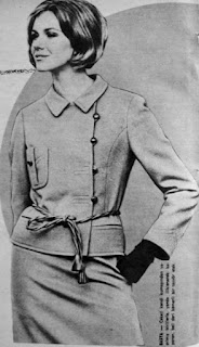 Ceketi kendi kumaşından yapılmış biritlerle yanda iliklenerek kapanan, beli deri kemerli bir tayyör etek...