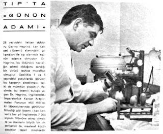 TIP'TA "GÜNÜN ADAMI " 28 yaşındaki İtalyan doktoru Gavino Negrino kan kanseri (lösemi) alanındaki çalışmaları ile tıp alanında "günün adamı" olmuştur. Dr. Negrino bu öldürücü hastalığın sebebi olduğunu sandığı bir virüsü teşhise muvaffak olmuştur. Özellikle 1 ve 5 yaşındaki çocuklarda görülen bu kanserin alt edilmesi belki de mümkün olacaktır. Resimde bu önemli buluşu yapan Dr. Negrino, İngiltere'deki imparatorluk kanser araştırmaları fonunun Mill Hill'deki laboratuvarında görülüyor. Bilindiği gibi lösemi (kan kanseri) her yıl İngiltere'de 7.000 kişinin ölümüne sebep olmakta ve ölenlerin büyük bir ekseriyetini de maalesef küçük çocuklar teşkil etmektedir...1964 |