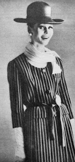 Siyah-beyaz kendisinden çizgili kumaştan bir tayyör etek, şapkası ve şalı ile şık bir takım...