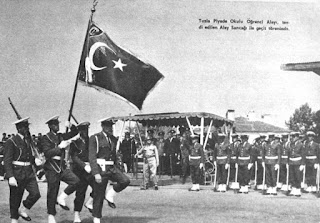 TUZLA PİYADE OKULUNA SANCAK VERİLDİ ! Tuzla piyade okulu öğrenci alayı tevdi edilen alay sancağı ile geçit töreninde. 11 Mayıs 1964 pazartesi günü Tuzla'da bulunan piyade okulu öğrenci alayına parlak ve son derece heyecanlı bir törenle alay sancağı tevdi edilmiştir. Sabah saat 10.00'da başlayan törende Genelkurmay başkanı Cevdet Sunay, Kara kuvvetleri komutanı Orgeneral Ali Keskiner, Deniz kuvvetleri kumandanı Oramiral Necdet Uran, Birinci ordu kumandanı Orgeneral Refik Yılmaz, İkinci ordu kumandanı Orgeneral Cemal Tural ve diğer davetliler hazır bulunmuştur. Alay sancağı birinci ordu kumandanı Orgeneral Refik Yılmaz tarafından Piyale okulu kumandanı Yarbay Niyazi Tuğ'a teslim edilmiştir. Şerefli sancağımızın tevdi merasiminden sonra bu müstesna ve tarihi gün Piyade alayının başlarında kumandanları, bütün yüksek rütbeli subayların ve diğer davetlilerin takdirle seyrettikleri bir geçit töreni ve daha sonra yeni tesislerin açılmasıyla sona ermiştir. |