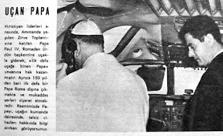 UÇAN PAPA Hristiyan liderleri arasında Amman'da yapılan zirve toplantısına katılan Papa 4. Paul, Roma'dan Ürdün başkentine uçakla giderek "İlk defa uçağa binen papa" unvanına hak kazanmıştır. Ayrıca 150 yıldan beri ilk defa bir papa Roma dışına çıkmakta ve mukaddes yerleri ziyaret etmektedir. Resmimizde Papayı, uçağın kumanda dairesinde telsiz cihazları hakkında bilgi alırken görüyorsunuz...1964 |