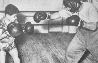 37 YAŞINDAKİ ŞAMPİYON VE OĞLU 1948 Londra yaz olimpiyatları, 1952 Helsinki yaz olimpiyatları, 1956 Melbourne yaz olimpiyatlarında altın madalya kazanmış Avrupa orta siklet boks şampiyonu Macar, Laszlo Papp 37 yaşına rağmen hala ringlerde zaferden zafere koşmaktadır. Papp, yakında yapacağı müsabakalara hazırlanırken 9 yaşındaki küçük oğlu babasının antrenmanlarını kaçırmadan takip etmekte ve fırsat buldukça da babasına karşı eldivenlerini giymektedir. Şampiyon boksör oğlunun kendisi gibi boksör olmasını çok arzu ettiği halde eşi asla bu fikirde değildir. Yukarıdaki fotoğrafta küçük Papp'ın işi gayet ciddi tutarak babası Avrupa şampiyonuna karşı tesirli atak yapmak için pozisyon kolladığı görülmekte...1964 |