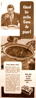 Güzel bir çorba Sana ile pişer ! PİRİNÇLİ DOMATES ÇORBASI Kullanılacak malzeme : 5 bardak et suyu, 50 gram SANA, 1 soğan, 1 havuç, 2 çorba kaşığı dolusu salça, 1 kahve fincanı pirinç, tuz, biber, maydanoz, limon suyu. Yapılması : SANA tencerede eritilir. Rende soğan, havuç ve ince kıyılmış maydanoz sapları biraz pembeleştirilir, çevirerek domates salçası ve et suyu ilave edilir. 10 dakika pişirilir. Süzülür, tekrar kaynatılır, yıkanmış ve iyice süzülmüş pirinç konur ve yarım saat ağır ateşte pişirilir, tuz-biber serpilir. Kaseye boşalttıktan sonra ince kıyılmış maydanoz konur. (Arzuya göre birkaç damla limon sıkılır). Daha sıhhi ve daha lezzetli yemekleriniz için... Sana Nebati Margarin...1959 |