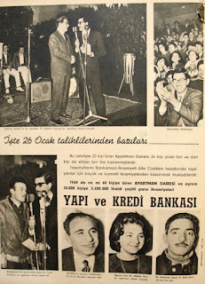 İşte 26 Ocak 1964 talihlilerinden bazıları.... (Tanınmış doktor ve ses sanatkarı B. Alaeddin Yavaşça bir apartman dairesi kazandı. / Kazananlar alkışlanıyor.) Bu çekilişte 20 kişi birer apartman dairesi, iki kişi yüzer bin ve dört kişide ellişer bin lira kazanmışlardır. Tasarruflarını bankamızın ikramiyeli aile cüzdanı hesabında toplayanlar için büyük ve kıymetli ikramiyelerden kazanmak muktedirdir. 1964'de en az 60 kişiye birer apartman dairesi ve ayrıca 10.00 kişiye 2.600.000 liralık çeşitli para ikramiyeleri. YAPI ve KREDİ BANKASI (Beyoğlu'nda bir apartmanda çalışan B. Yusuf Karakaş'a bir apartman dairesi isabet etti. / 100.000 lira kazanan talihlilerden biride B. Muzaffer Akkülah oldu. / Öğrenci olan bayan Nükhet Teker bir apartman dairesi kazandı. / Bir fabrikada çalışan B. Halil Süer'e elli bin lira çıktı.) |
