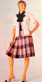 CHANEL bu modelinde zarif ve kolay giyimli ana hatlarından yine ayrılmamış. Bu modeli pembe-lacivert kareli yünlü tüvitten plili bir etek ile belin hemen altına inen kısa kollu beyaz bir ceketten oluşmuş. Ceket yer yer eteğin renklerini taşıyan biyelerle süslenmiş. Boyun kısmında büyük bir fiyonk ile bağlanan elbisenin sade görünüşlü bluzu lacivert ipek jorjet... 1972 |