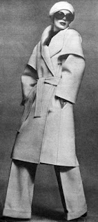 Christian Dior'dan bir pantolon takımı. Beyaz flanel pantolon bol kesimlidir. Paçalar artist Marlene Dietrich'in bir zamanlar pek meraklı olduğu tarzda kıvrılmıştır. İnce beyaz yünlüden yapılan mantonun reglan kesimli kolu ayrıca ilgi çekicidir. Mantonun şal yakası ve üstten bağlanan bir kemeri vardır. |
