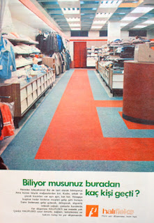 BİLİYOR MUSUNUZ BURADAN KAÇ KİŞİ GEÇTİ ? Nereden bileceksiniz ? Bizde tam olarak bilmiyoruz. Ama burası büyük mağazalardan biri. Kadın, erkek ve çocuk kısımları var ayrı ayrı, kat kat. Hesapça bugüne kadar binlerce müşteri gelip gitti buraya. Daha binlercesi gelip gidecek, dolaşacak, alışveriş edecek. Yağışlı, çamurlu havalarda yer döşemesi HALIFLEKS ise mesele yok. Çünkü HALIFLEX uzun ömürlü, sağlam, temizlemesi ve bakımı kolay bir yer döşemesidir. halıflex Hem yer döşemesi, hem halı. (1972) |