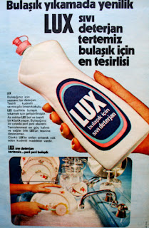 Bulaşık yıkamada yenilik LUX sıvı deterjan tertemiz bulaşık için en tesirlisi LUX Bulaşığınız için yepyeni bir deterjan. Tesirli... Kudretli... Ve mis gibi kokulu. LUX özellikle bulaşık yıkamak için geliştirilmiştir. Az miktar LUX bol ve tesirli bir köpük yapar. Bulaşığınız bir çırpıda pırıl pırıl oluverir. Temizlenmesi en güç kalıntı ve yağlar bile LUX'ün tesirine dayanamaz. Çünkü LUX'te onları eriterek yok eden kudretli maddeler vardır. LUX sıvı deterjan, tertemiz... Pırıl pırıl bulaşık. (1972) |