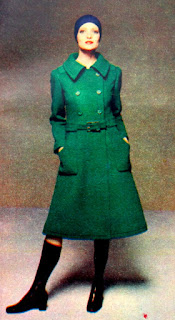 Nina Ricci'nin gençler için tasarladığı "Mademoiselle Ricci" adlı bölümünden bir spor manto. Yeşil dra kumaştan yapılan mantonun çift sıra düğmeleri bele kadar inmektedir. Aynı kumaştan kemeri mantoya ayrı bir özellik katmakta. Modacı kesimi belirtmek için iri makine dikişlerini geniş ölçüde kullanmıştır...1972 |