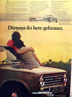 Dünyaya iki kere gelinmez... Çekin evinizin önüne hayatınızın akışını değiştirecek, yaşamanın tadını verecek, sıfır kilometre'deki Murat 124'ü. Daha hesaplı, daha mutlu ve yepyeni günler başlasın sizin için. Sabahları yağmur altında dolmuş, otobüs beklemeyin. İşinize rahatça ve tam vaktinde yetişin. Akşam işten çıkınca evinize nasıl gideceğinizi düşünmeyin. Hafta sonlarında geçin Murat'ınızın direksiyonuna çoluk-çocuk ya da eş-dost ya da tek başınıza dilediğiniz yere gidin. Tatillerinizi daha iyi değerlendirin. Güçlü Murat'ın kullanışlılığı içinde... Bayramlarda yakın şehirlere gidin. Görmediğiniz yerleri görün. İçmediğiniz suları için.Yaşamanın tadını çıkarın... Dünyaya bir kere geliniyor ve giden günler geri gelmiyor. Tasarruflarınızı Murat 124'e yatırın. Murat 124'ün teknik özellikleri : Tüm çelik monoblok gövde 65 beygirlik harika bir motor. Çift boğazlı karbüratör. Saatte 140 km'den fazla sürat. 4 tekerlekte disk fren. Arka tekerlekler için özel fren regülatörü. Servo fren tertibatı. Her tekerlekte bağımsız süspansiyon. Lüks döşemeli 5 büyük kişilik yer. Her yönde kesintisiz görüş alanı. Özel tertibatlı cam silecekleri, kalorifer ve güçlü geri far... Murat 124 için uygulanan taksitle ödeme kolaylıklarını yurdun dört bir yanındaki Tofaş bayilerinden öğreniniz. Türkiye genel distribütörü : TOFAŞ Oto Ticaret A.Ş. Gayrettepe - İstanbul Murat 124 "Hesaplı otomobil..." (1972) |