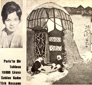 PARİS'TE BİR TABLOSU 10.000 LİRAYA SATILAN KADIN TÜRK RESSAM... Ayla Seli genç bir Türk ressamı. Son defa Türkiye'de yaptığı 25 tablosunu Paris'te Türk turizm bürosunun salonlarında sergileyen Seli büyük alaka görmüş ve 4 Kasım 1972'de açılan sergisi 4 Aralık'ta kapanması gerekirken bu yüzden yılbaşına kadar uzatıldı. Yağlı boya tablolara 1.000 - 3.500 frank (takriben 2.800 - 9.800 lira) arasında fiyat konulan sergi, Paris'in sanat çevresi olmayan Champs Elysées'deki Turizm büromuzun salonlarında açılmasına rağmen tabloların yarısından çoğu satıldı. Ayla Seli'nin tablolara konu olarak Anadolu şehirlerini seçmesi ve daha çok Anadolu'ya has canlı renkler kullanması sergiye ayrı bir özellik kazandırdı... |
