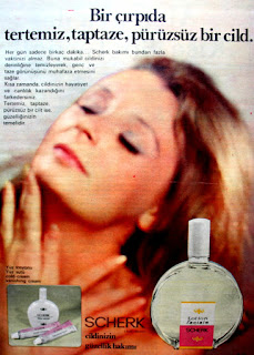 Bir çırpıda tertemiz, taptaze, pürüzsüz bir cilt. Her gün sadece birkaç dakika... Scherk bakımı bundan fazla vaktinizi almaz. Buna mukabil cildinizi derinliğine temizleyerek genç ve taze görünüşünü muhafaza etmesini sağlar. Kısa zamanda cildinizin hayatiyet ve canlılık kazandığını fark edersiniz. Tertemiz, taptaze, pürüzsüz bir cilt ise güzelliğinizin temelidir. Yüz losyonu, yüz sütü - Cold cream - Vanishing cream. SCHERK (Şerk okunur) Cildinizin güzellik bakımı (1972) |