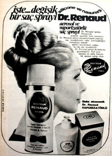 İşte... Değişik bir saç spreyi : Silicone ve nasuna'lı Dr. Renaud aerosol ve vaporizatörlü saç spreyi Dr. Renaud spreyi... Her şeyiyle değişik, güzellik dolu, besleyici... Dr. Renaud spreyi saçlarda kepek yapmaz, saç tuvaletinizin tabii yumuşaklığını muhafaza ederek şeklini korumasını sağlar... Sizde saç tuvaletinizi Dr. Renaud spreyi ile dahada güzelleştirin. Pırıl pırıl saçlara ve nefis kokulu bir spreye sahip olun. Daha ekonomik Docteur Renaud Paris VAPORİZATÖRLÜ (1972) |
