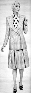 Jeanne Lanvin'den beyaz üzerine kırmızı ince çizgili bir tayyör. Kruvaze ve altı düğmeli olan ceket erkek kıyafetlerini andırmaktadır. Yakası değişik bir tarzdadır. Eteğin önünde iki pli kaşesi bulunmaktadır. Bu tayyörün bluzu üzerinde kırmızı modern hatlı kurbağa desenleri olan beyaz yünlü emprimeden yapılmıştır...1972 |