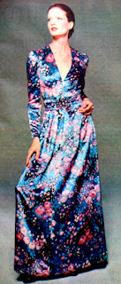 Mademoiselle Ricci'nin gençler için hazırlamış olduğu sade bir gece elbisesi. Siyah üzerine pembe, mavi, leylak ve turkuaz renklerindeki çiçekli ipek emprimeden hazırlanan elbisenin derin bir V yakası vardır. Kol takılışı ve taşlarla süslü bir tokası olan kemeri oldukça ilgi çekici...1972 |
