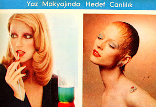 1972 YAZ MAKYAJINDA HEDEF CANLILIK Ünlü makyaj uzmanları Elizabeth Arden ve Helena Rubinstein ilkbahar-yaz makyajının ana hatlarını şu şekilde belirtiyorlar : ELIZABETH ARDEN : Yüzde, dudaklar önce göze çarpacak şekilde koyu kırmızı ruj kullanılacak. Gözlerde ise kirpiklere ağırlık veriyor. Bol rimel ve takma kirpik kullanıyor (solda)... HELENA RUBINSTEIN : Dudaklar canlı ve kırmızı. Gözlere mavilik hakim. Kirpikler ince. Göz kapakları ise mavi veya yeşil sedefli farlarla belirginleştiriliyor (sağda)... |