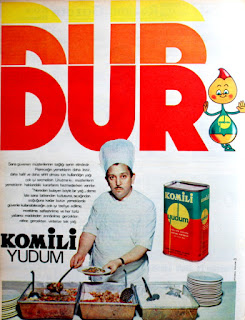 DUR ! Sana güvenen müşterilerinin sağlığı senin elindedir. Pişireceğin yemeklerin daha leziz, daha hafif ve sıhhi olması için kullandığın yağı çok iyi seçmelisin. Unutma ki; müşterilerin yemeklerin hakkındaki kararlarını hazmederken verirler. "Nereden bulayım böyle bir yağ ?..." deme. İşte sana tatlısından tuzlusuna, sıcağından soğuğuna kadar bütün yemeklerde güvenle kullanabileceğin çok iyi tasfiye edilmiş, inceltilmiş, saflaştırılmış ve her türlü yabancı maddeden arındırılmış gerçekten rafine, gerçekten vinterize tek yağ : KOMİLİ YUDUM (1972) |