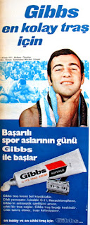 Gibbs en kolay tıraş için 62 kiloda 1971 Akdeniz oyunları Greko-Romen şampiyonu Mücahit Güngör. Başarılı spor aslarının günü Gibbs ile başlar : Gibbs tıraş kremi bol köpüklüdür. Cildi yumuşatır. İçindeki G-11, Hexachlorophene Gibbs'in antiseptik özelliğini arttırır, sıhhi bir tıraş sağlar. Gibbs tıraş bıçağı keskindir. Cildi tahriş etmez, tıraşı kolaylaştırır. En kolay ve en sıhhi tıraş için Gibbs... (1972) |