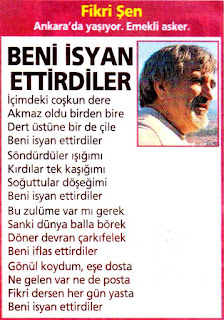 BENİ İSYAN ETTİRDİLER İçimdeki coşkun dere Akmaz oldu birden bire Dert üstüne bir de çile Beni isyan ettirdiler Söndürdüler ışığımı Kırdılar tek kaşığımı Soğuttular döşeğimi Beni isyan ettirdiler Bu zulme var mı gerek Sanki dünya balla börek Döner devran çarkıfelek Beni iflas ettirdiler Gönül koydum, eşe dosta Ne gelen var ne de posta Fikri dersen her gün yasta Beni isyan ettirdiler... Fikri Şen Ankara'da yaşıyor. Emekli asker. |