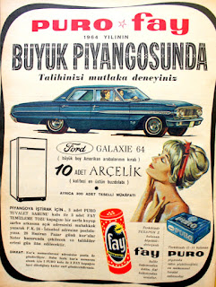 PURO - FAY 1964 YILININ BÜYÜK PİYANGOSUNDA Talihinizi mutlaka deneyiniz. Ford GALAXIE 64 (Büyük boy Amerikan arabalarının kralı) 10 adet ARÇELİK kalitesi en üstün buzdolabı AYRICA 300 ADET TESELLİ MÜKAFATI. PİYANGOYA İŞTİRAK İÇİN... 3 adet PURO TUVALET SABUNU kabı ile 3 adet FAY TEMİZLEME TOZU kapağını bir zarfa koyup zarfın arkasına açık adresinizi muhakkak yazarak P.K. 24 - İstanbul adresine postalayın. 28 Haziran 1964 Pazar günü kur'alar noter huzurunda çekilecek ve talihliler ertesi gün ilan edilecektir. DİKKAT : Kur'a numaralarınız adresinize posta ile gönderiliyor. Daha fazla kur'a numarası almak için 3 PURO kabı ile 3 FAY kapağını havi dilediğiniz kadar zarf gönderebilirsiniz. Terkibinde TEXAPON Z bulunan köpüklü - deterjanlı FAY kalite bakımından üstün, fiyat bakımından ucuzdur. Terkibinde G-11 bulunan PURO piyasada satın alabileceğiniz en mükemmel tuvalet sabunudur... |