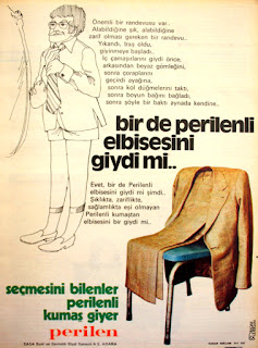 Önemli bir randevusu var... Alabildiğine şık, alabildiğine zarif olması gereken bir randevu... Yıkandı, tıraş oldu, giyinmeye başladı... İç çamaşırlarını giydi önce, arkasından beyaz gömleğini, sonra çoraplarını geçirdi ayağına, sonra kol düğmelerini taktı, sonra boyun bağını bağladı, sonra şöyle bir baktı aynada kendine... Bir de Perilenli elbisesini giydi mi... Evet, bir de Perilenli elbisesini giydi mi şimdi... Şıklıkta, zariflikte, sağlamlıkta eşi olmayan Perilenli kumaştan elbisesini bir giydi mi... Seçmesini bilenler Perilenli kumaş giyer. Perilen SASA Sun'i ve Sentetik Elyaf Sanayi A. Ş. - ADANA (1972) |