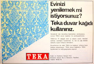 Evinizi yenilemek mi istiyorsunuz ? Teka duvar kağıdı kullanınız. Senelerdir düz duvarlara bakmaktan sıkıldıysanız, evinizi TEKA duvar kağıtları ile yenileyebilirsiniz. TEKA'nın 71 değişik renk ve deseni vardır. Renkleri solmaz, canlılığını kaybetmez. İs, toz ve yağ lekeleri sabunlu suyla kolayca temizlenir. Duvarlarınızı bir defa TEKA ile kaplayın, yıllarca boya badana düşünmeyin. TEKA duvar kağıtlarını TEKA bayilerinde ve mefruşatçılarda arayınız. TEKA Kağıt ve Kaplama Sanayii A. Ş. Birahane sokak no 3, Bomonti - İstanbul (1972) |