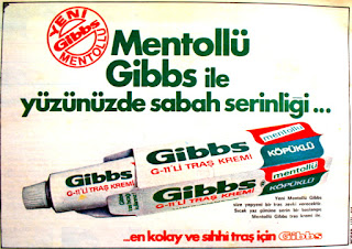 YENİ Gibbs MENTOLLÜ ile yüzünüzde sabah serinliği... Gibbs G-11'Lİ TIRAŞ KREMİ MENTOLLÜ - KÖPÜKLÜ Yeni mentollü Gibbs size yepyeni bir tıraş zevki verecektir. Sıcak yaz gününe serin bir başlangıç Mentollü Gibbs tıraş kremi ile. En kolay ve sıhhi tıraş için Gibbs. (1972) |