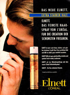 DAS NEU ELNETT, EXTRA STARKER HALT. ELNETT. DAS FEINSTE HAAR - SPRAY VON L'OREAL. FÜR DIE CREATION DER SCHÖNSTEN FRISUREN. ELNETT ist jetzt noch feiner, leichter und spürbar trockener. Est gibt Ihrer Frisur perfekten Halt und lasst sie dabei ganz natürlich aussehen. ELNETT lasst sich ganz gleichmassig verteilen und spielend leicht wieder ausbürsten. ELNETT mit der Mikrofeinsprühung und dem neuen L'Oréal Treibmittelsystem*. ELNETT - für Ihre schönsten Frisuren * Enthalt kein FCKW. Ozon - unschadlich. Elnett L'OREAL (1989) |