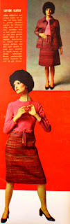 Nina Ricci'nin butiğinden başka bir örnek : Üst kısmı fantezi pembe yünlüden yapılan bu elbisenin eteği mavi, canlı kırmızı, menekşe rengi ve kirli pembe karışımı olan tüvit görünüşünde yünlü bir kumaştan hazırlanmıştır. Etekle aynı kumaştan dikilmiş olan dört cepli ceketle takıma aynı zamanda bir tayyör havası verilmek istenmiştir. Bluzun pembesinden yapılan kıyafetin kemeri de göz alıcıdır...1972 |