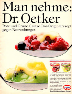 | Man Nehme : Dr. OETKER Rote und Grüne Grütze. Das Originalrezept gegen Beerenhunger. FEINE DESSERTS Zu den kleinen Gaumenfreuden, auf die Geniesser grosse Stücke halten, gehören auch Dr. Oetker Rote und Grüne Grütze. Zwei Dessert-Spezialitaten, die wir nach Sylter Originalrezept zubereitet haben. Mit vielen saftigen Beeren, grossen Fruchtstücken und köstlicher Bourbon-Vanille-Sauce im praktischen Kippbecher. Eine unvergleichliche Kompositon, die Sie mal probieren sollten. Weil gegen echten Beeren-hunger eben nur etwas wirklich Feines fruchtet. Dr. Oetker Qualitat ist das beste Rezept. (1989) |