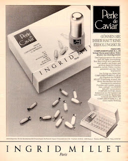 Perle de Caviar GÖNNEN SIE IHRER HAUT EINE ERHOLUNGSKUR PRINCIPE COMPLEMENTAIRE H. L. 28 bringt Ihren gestressten Teint wieder ins Gleichgewicht. Das Ergebnis spüren Sie schon nach 28 Tagen Anwendung : Ihre Haut erholt sich zusehends, wird straffer und fester und gewinnt damit ihr frisches Aussehen zurück. Falten werden gemindert und der Teint strahlender. Der Erfolg von PRINCIPE COMPLEMENTAIRE H. L. 28 ist das Ergebnis der INGRID MILLET-Forschung, wonach der ideale Hautzustand auf dem Gleichgewicht zwischen Protiden und Lipiden beruht. Dem exklusiv von INGRID MILLET verwendeten COMPLEX CAVIAR, einem Konzentrat zur Revitalisierung und Aktivierung der Epidermis, verdankt das PRINCIPE COMPLEMENTAIRE H. L. 28 seine rasche Wirkung. Alleinimporteur für die Bundesrepublik Deutschland : Parfümerie - Import Peters & Sickert KG, Essen 1. INGRID MILLET Paris (1989) |