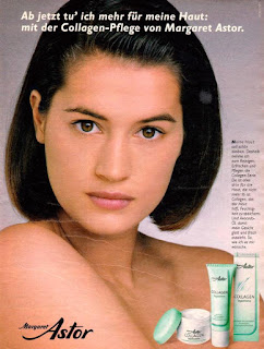 Ab jetzt tu' ich mehr für meine Haut : Mit der Collagen-Pflege von Margaret Astor. Meine Haut soll schön bleiben. Deshalb nehme ich zum Reinigen, Erfrischen und Pflegen die Collagen-Serie. Da ist alles drin für die Haut, die nicht mehr 16 ist : Collagen, das der Haut hilft. Feuchtigkeit zu speichern. Und Avocado-Öl, damit mein Gesicht glatt und frisch aussieht. So, wie ich es mir wünsche. Margaret Astor 1989. |