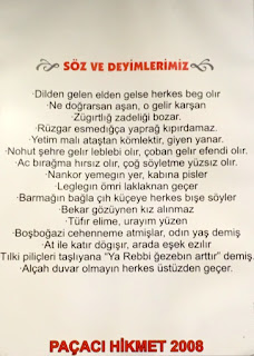 SÖZ VE DEYİMLERİMİZ - Dilden gelen elden gelse herkes beg olur. - Ne doğrarsan aşan, o gelir karşan. - Zügirtlığ zadeliği bozar. - Rüzgar esmedığça yaprağ kıpırdamaz. - Yetim malı ataştan kömlektir, giyen yanar. - Nohut şehre gelır leblebi olır, çoban gelır efendi olur... - Ac bırağma hırsız olır, çoğ söyletme yüzsız olur. -Nankor yemegin yer, kabına pisler. - Leglegin ömri laklaknan geçer. - Barmağın bağla çıh küçeye herkes bışe söyler. - Bekar gözüynen kız alınmaz. - Tüfır elime, urayım yüzen. - Boşboğazi cehenneme atmişlar, odın yaş demiş. - At ile katır dögışır, arada eşek ezılır. - Tilki piliçleri taşlıyana "Ya Rebbi ğezebin arttır" demiş. - Alçah duvar olmayın herkes üstüzden geçer. Paçacı Hikmet 2008. |