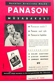 Anneler Arasında Büyük PANASON MÜSABAKASI 1 - Panason nedir ? 2 - Panason nasıl içilir ? 3 - Panason'un faydaları ? Yukarıdaki üç soruyu en kısa ve özlü olarak cevaplandıran annelerin yazıları seçkin bir jüri heyeti tarafından değerlendirilecek, birden onuncuya kadar derece alanlar ilan edilecek ve kazandıkları hediyeler adreslerine gönderilecektir. KAZANANLARA 1 - SALON RADYOSU 2 - ÇOCUK ARABASI 3- ÇAMAŞIR MAKİNESİ VE Muhtelif çeşitte kıymetli hediyeler verilecektir. NETİCELER : Hayat mecmuası ve Hürriyet gazetesinde ilan edilecektir. Lokman İlaç ve Gıda Sanayii (1964 Hikmet) |