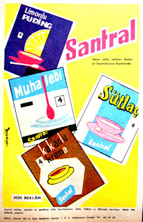 Santral hazır sütlü tatlıları (Limonlu puding, Muhallebi, Sütlaç, Kakaolu krema) bütün ev hanımlarının hizmetinde. Santral tatlıları sterilize ve pastörize sütle hazırlanmıştır. Saftır. Sadece su ilavesiyle hazırlanır. Bütün bakkallarda arayınız. (Mim Reklam 1964) |